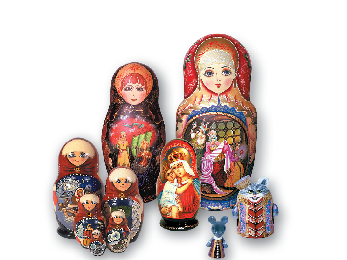Classic Russian Dolls range from the tradition of Russian folk art encompassing a wide range of Floral, inspirational Folk Tales and the symbolism of strength and unity in Family Dolls.